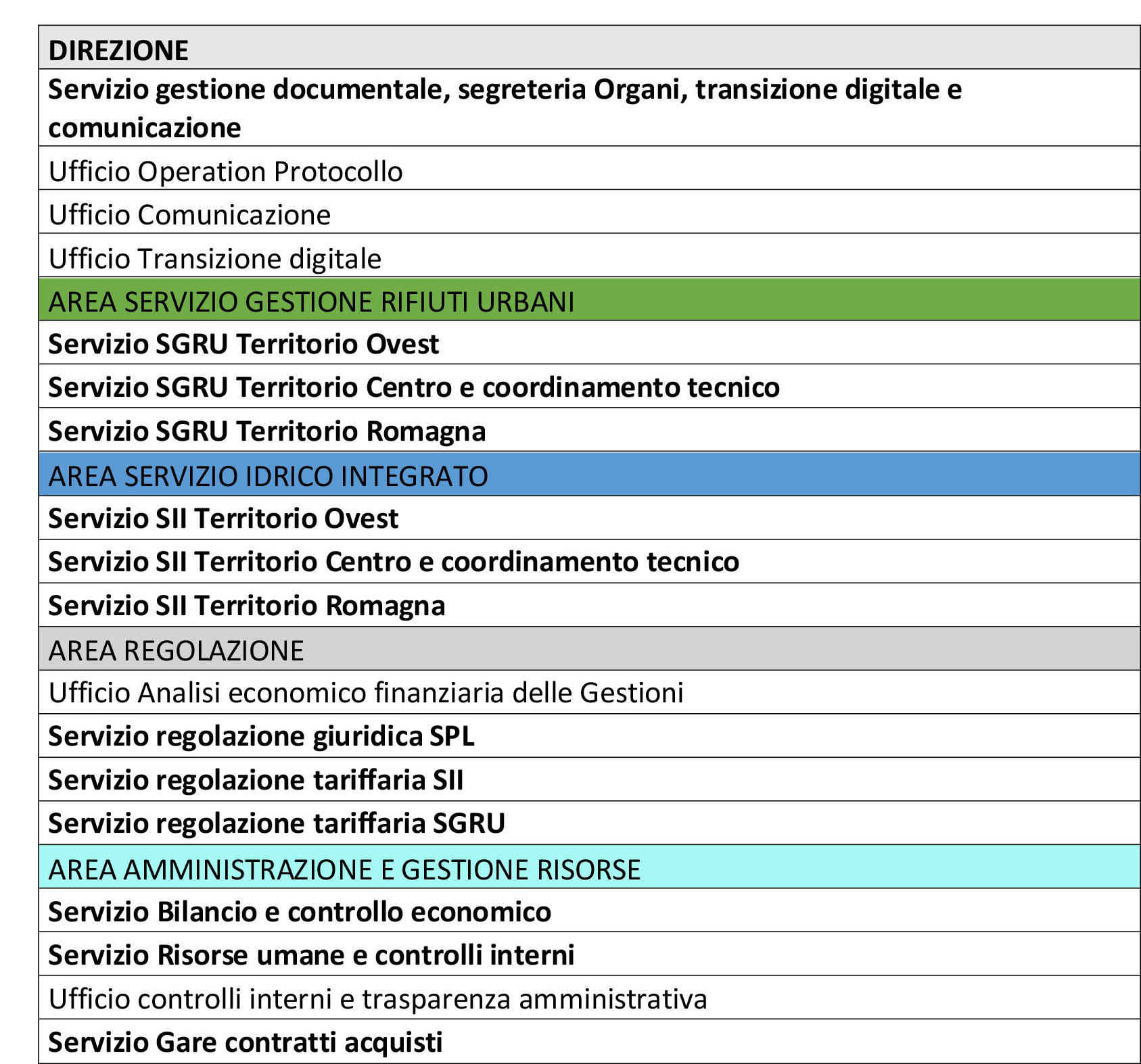 - Area «Servizio Gestione Rifiuti Urbani» (SGRU) con funzioni di pianificazione d’ambito tecnico-economica (pianificazione del servizio e degli investimenti e programmazione economico-finanziaria), Affidamento del servizio, Controllo delle gestioni e della Qualità tecnica e contrattuale, Predisposizione della documentazione tecnico-economica finalizzata agli affidamenti e gestione degli stessi;